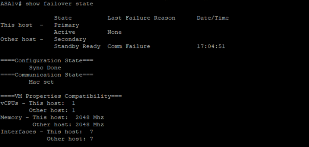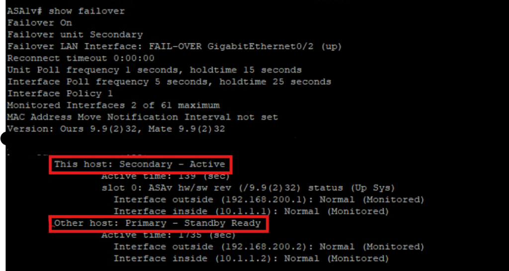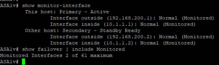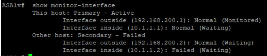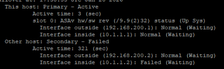 Now we see one of interface connected to ASAv11 to Switch Failed so ASAv1 become active now.