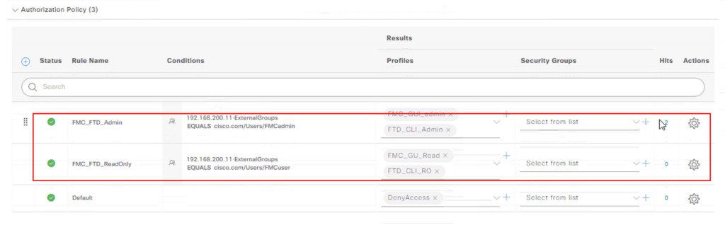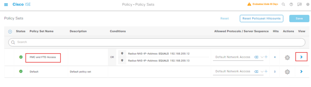 Select the Policy Set (in this example – FMC and FTD Access) click on >