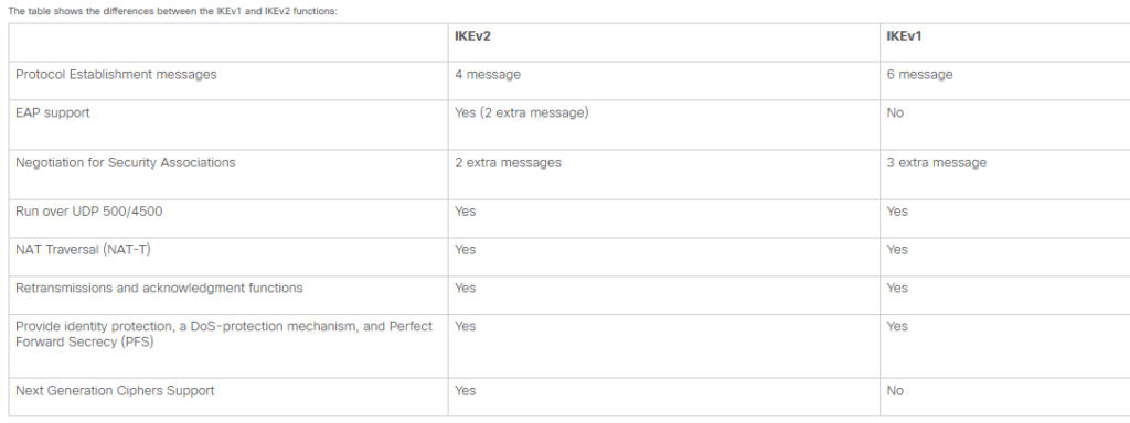 The table shows the differences between the IKEv1 and IKEv2 functions: